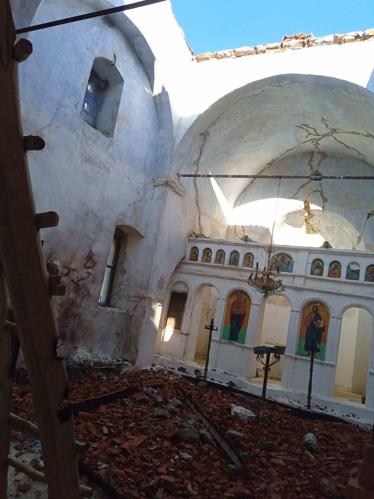 Βρεθήκαμε και πάλι, δεκαπέντε μήνες μετά την καταστροφική πυρκαγιά του Αυγούστου του 2021, με την προσδοκία να αντικρύσουμε σωστικές εργασίες αποκατάστασης ειδικά στον εμβληματικό και μεγαλοπρεπή πέτρινο Ναό του Αγίου Κωνσταντίνου στον Πολυάραβο που είχε υποστεί σοβαρότατες ζημιές (κατάρρευση καμένης στέγης κλπ).