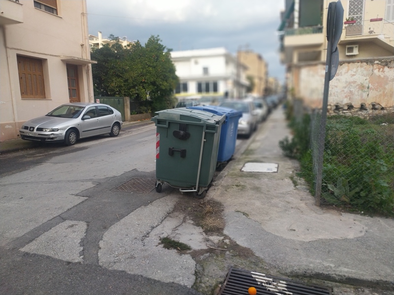 Κάδοι απορριμμάτων παρεμποδίζουν τον οδηγό να ελέγξει δεξιά την Χαμαρέτου.