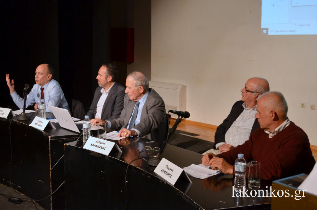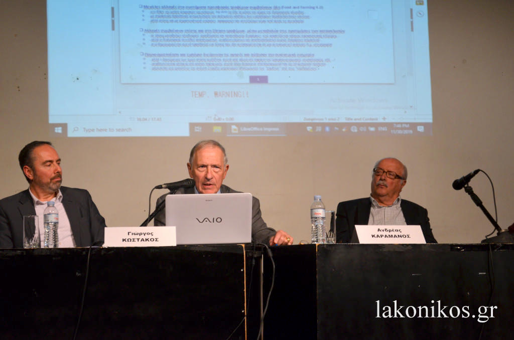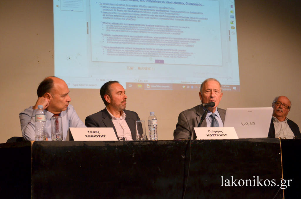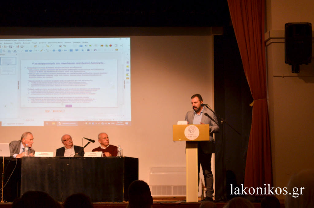 Κεντρικοί ομιλητές ήταν ο κ. Ανδρέας Καραμάνος, καθηγητής της Γεωργίας στο Γεωπονικό Πανεπιστήμιο Αθηνών, ο Λάκωνας κ. Γιώργος Κόκκινος, πρόεδρος της Ομάδας Ελαιοπαραγωγών «Νηλέας» Μεσσηνίας και ο κ. Τάσος Χανιώτης, διευθυντής του Τμήματος Οικονομικής Ανάλυσης στη Γενική Διεύθυνση Γεωργίας της Ευρωπαϊκής Επιτροπής στις Βρυξέλλες.