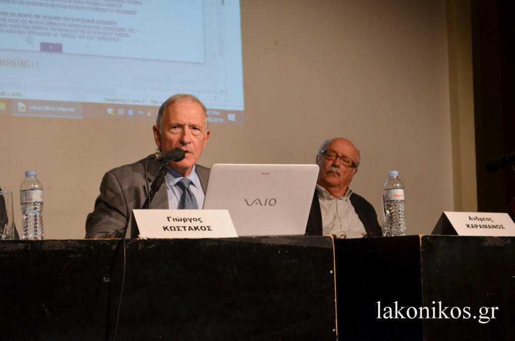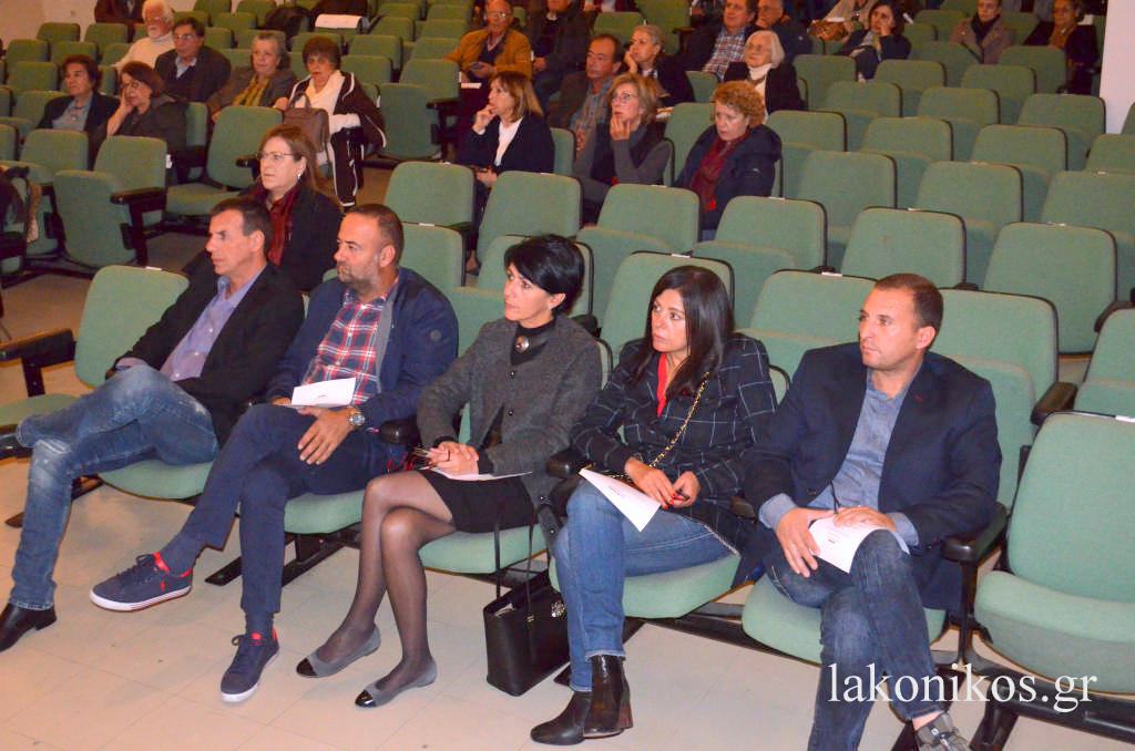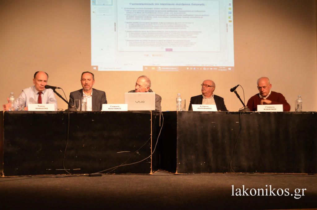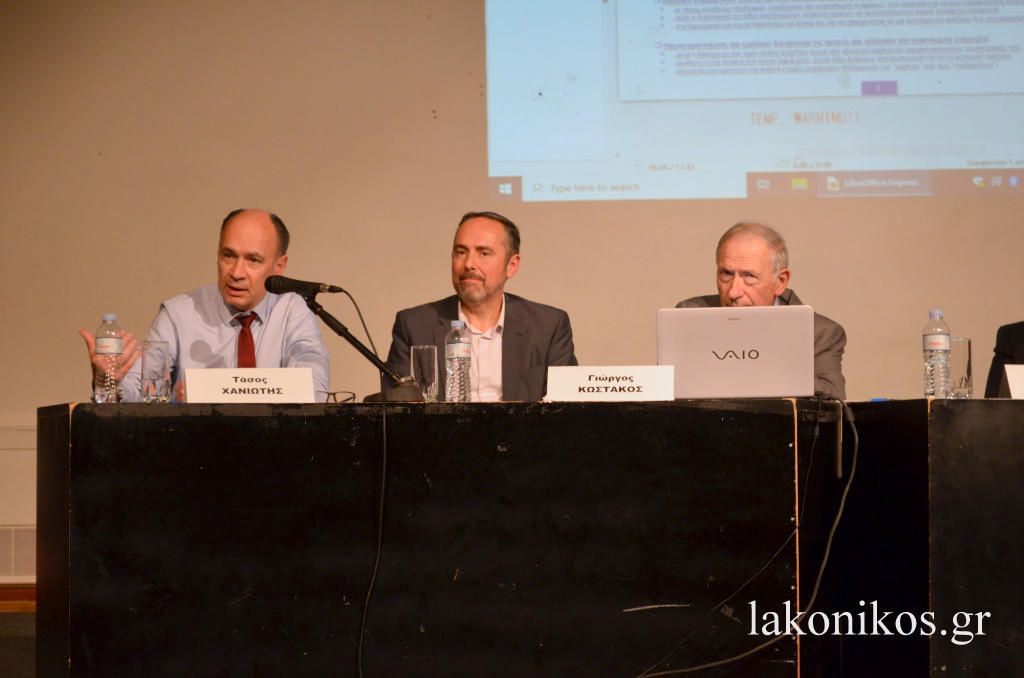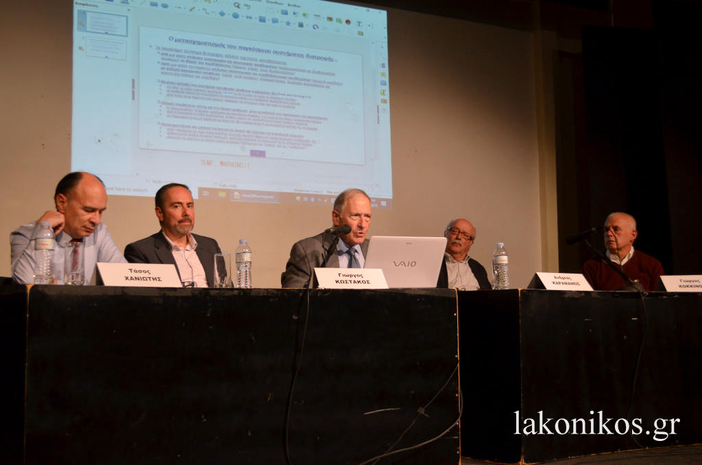 Κεντρικοί ομιλητές ήταν ο κ. Ανδρέας Καραμάνος, καθηγητής της Γεωργίας στο Γεωπονικό Πανεπιστήμιο Αθηνών, ο Λάκωνας κ. Γιώργος Κόκκινος, πρόεδρος της Ομάδας Ελαιοπαραγωγών «Νηλέας» Μεσσηνίας και ο κ. Τάσος Χανιώτης, διευθυντής του Τμήματος Οικονομικής Ανάλυσης στη Γενική Διεύθυνση Γεωργίας της Ευρωπαϊκής Επιτροπής στις Βρυξέλλες.