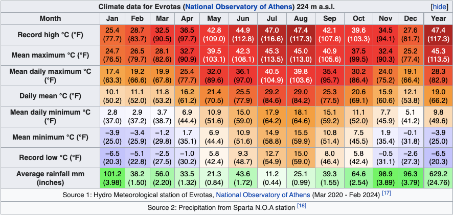 Καθώς σιγά-σιγά το καλοκαίρι πλησιάζει, τα πρόσφατα δεδομένα του υδρομετεωρολογικού σταθμού του Ευρώτα από το Εθνικό Αστεροσκοπείο Αθηνών (ΕΑΑ) επιβεβαιώνουν πως η πεδιάδα του Ευρώτα αποτελεί τη θερμότερη περιοχή της επικράτειας σε καλοκαιρινές μέγιστες θερμοκρασίες.