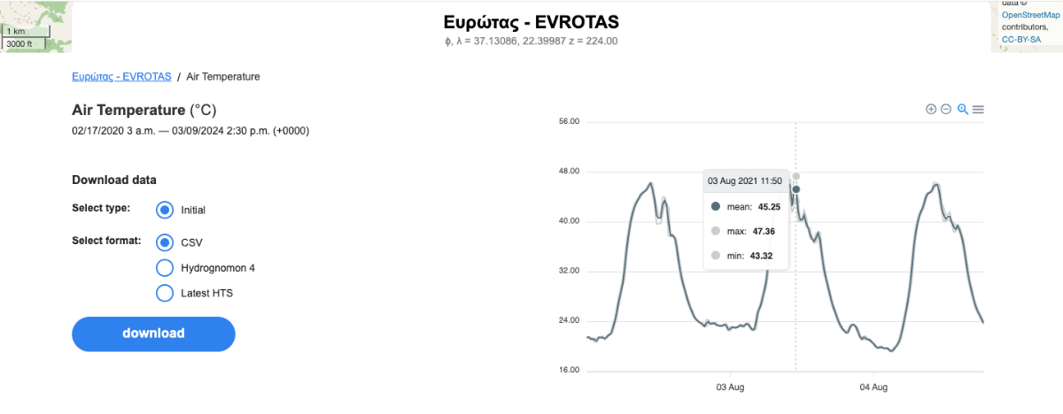 Πιο συγκεκριμένα, στις 3/8/2021 ο σταθμός (ΕΑΑ) του Ευρώτα που έχει εγκατασταθεί στο ύψος του Καραβά βορειοδυτικά της Σπάρτης, κατέγραψε την τιμή ρεκόρ για τη Λακωνία με 47.4°C. Αντίστοιχα, την ίδια περίοδο του μεγάλου καύσωνα Ιουλίου/Αυγούστου 2021, ο δεύτερος υδρομετεωρολογικός σταθμός του ΕΑΑ στην τοποθεσία Κελεφίνας μέτρησε 47.1°C.