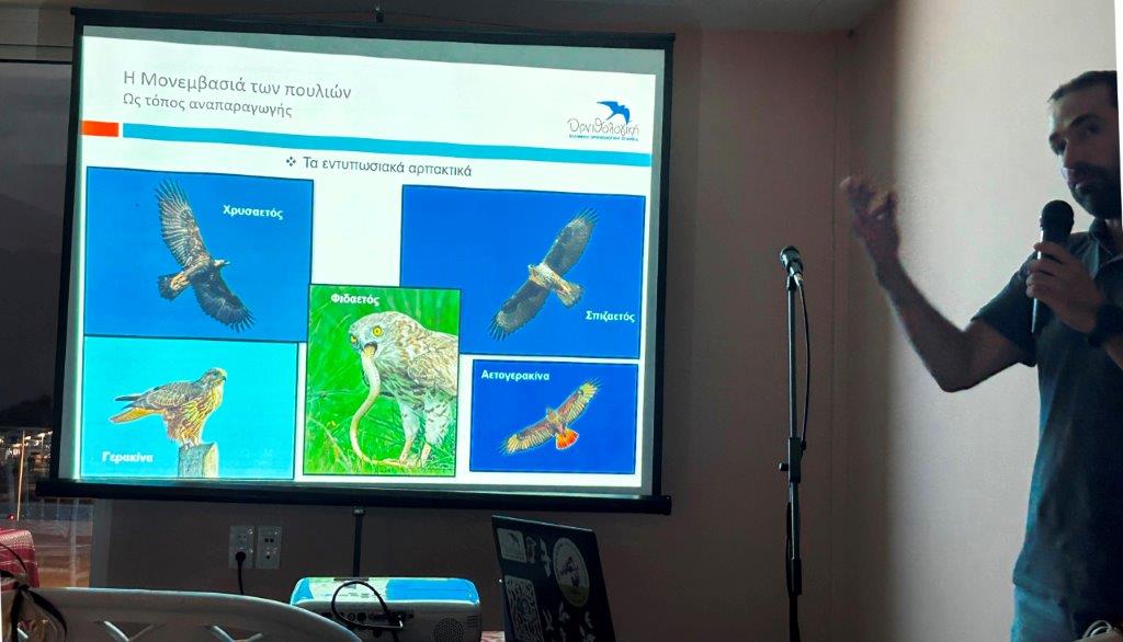 Η πρώτη δράση ενημέρωσης πραγματοποιήθηκε το Σάββατο (12/10) στο νεότευκτο Τουριστικό Περίπτερο του Δήμου Μονεμβασιάς, υπό την αιγίδα του. Περιλάμβανε την παρουσίαση των σημαντικών είδη ορνιθοπανίδας, με έμφαση στον απειλούμενο σπιζαετό, από τον συντονιστή του προγράμματος «LIFE Bonelli EastMed Διατήρηση και Διαχείριση του πληθυσμού του Σπιζαετού στην ανατολική Μεσόγειο», Νίκο Τσιόπελα, καθώς και των δράσεων διαχείρισης ειδών και οικοτόπων τού ΟΦΥΠΕΚΑ στη Λακωνία, από τον αναπληρωτή προϊστάμενο της ΜΔΠΠΝΠ, Δημήτρη Μπαρέλο. Τις ομιλίες έκλεισε ο Νίκος Ψαράκης, υπεύθυνος περιβαλλοντικών δράσεων τού Συλλόγου «Τουλίπα Γουλιμή» μιλώντας για τη σημασία του σταθμού πρώτων βοηθειών άγριων ζώων που βρίσκεται σε λειτουργία από τον σύλλογο στην ευρύτερη περιοχή. Παράλληλα, στον εξωτερικό χώρο τού περιπτέρου, οι επισκέπτες της εκδήλωσης είχαν την ευκαιρία να περιηγηθούν στην έκθεση φωτογραφίας της Ελληνικής Ορνιθολογικής Εταιρεία, με θέμα τον Σπιζαετό.