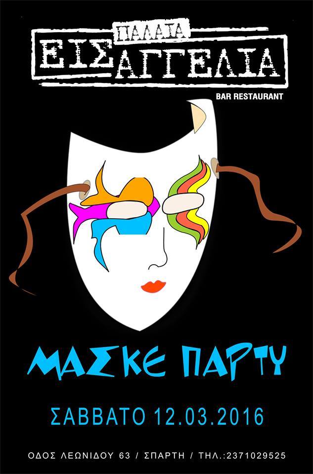 22.00 | Αποκριάτικο μασκέ πάρτυ από τη Λέσχη Φωτογραφίας Σπάρτης στο κέντρο ΑΜΙ (πλατεία Μαγούλας). Είσοδος ελεύθερη. Ζωντανή μουσική από τις "Λαϊκές Νότες".