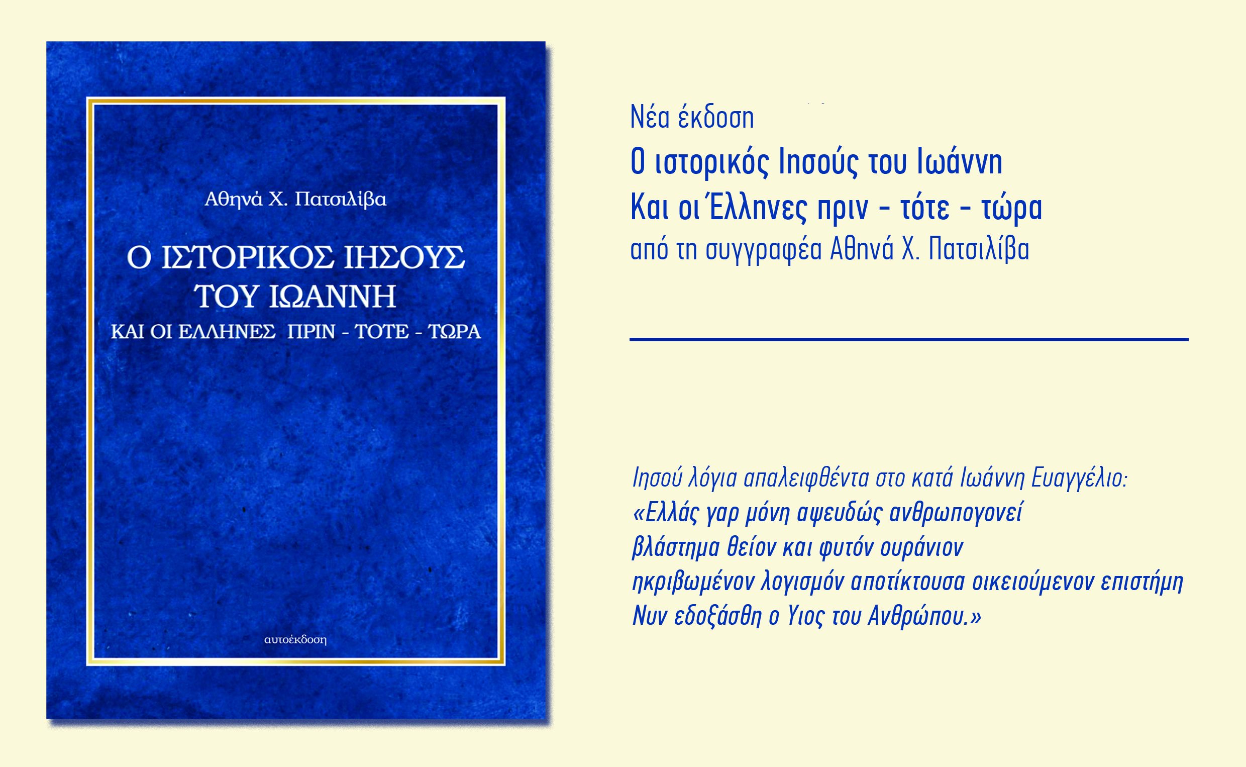 Μία νέα έκδοση υπό τον τίτλο «Ο ιστορικός Ιησούς του Ιωάννη και οι Έλληνες πριν - τότε - τώρα», της Λάκαινας Αθηνάς Χ. Πατσιλίβα, ολοκληρώθηκε και κυκλοφορεί.