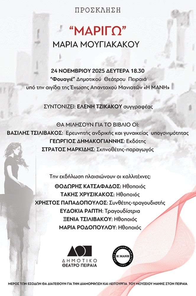 Μια ιδιαίτερη λογοτεχνική βραδιά με έντονο μανιάτικο στίγμα θα πραγματοποιηθεί τη Δευτέρα 24 Νοεμβρίου στις 18.30 στο «Φουαγιέ» του Δημοτικού Θεάτρου Πειραιά, όπου η Μανιάτισσα συγγραφέας Μαρία Μουγιακάκου παρουσιάζει το βιβλίο της «Μαριγώ», το οποίο ήδη βρίσκεται στην δεύτερη έκδοσή του. Η εκδήλωση τελεί υπό την αιγίδα της Ένωσης Απανταχού Μανιατών «Η Μάνη» και φιλοδοξεί να μεταφέρει στο κοινό την ατμόσφαιρα, την παράδοση, τα διλήμματα και τα τραγικά πάθη της γης που γέννησε το έργο.