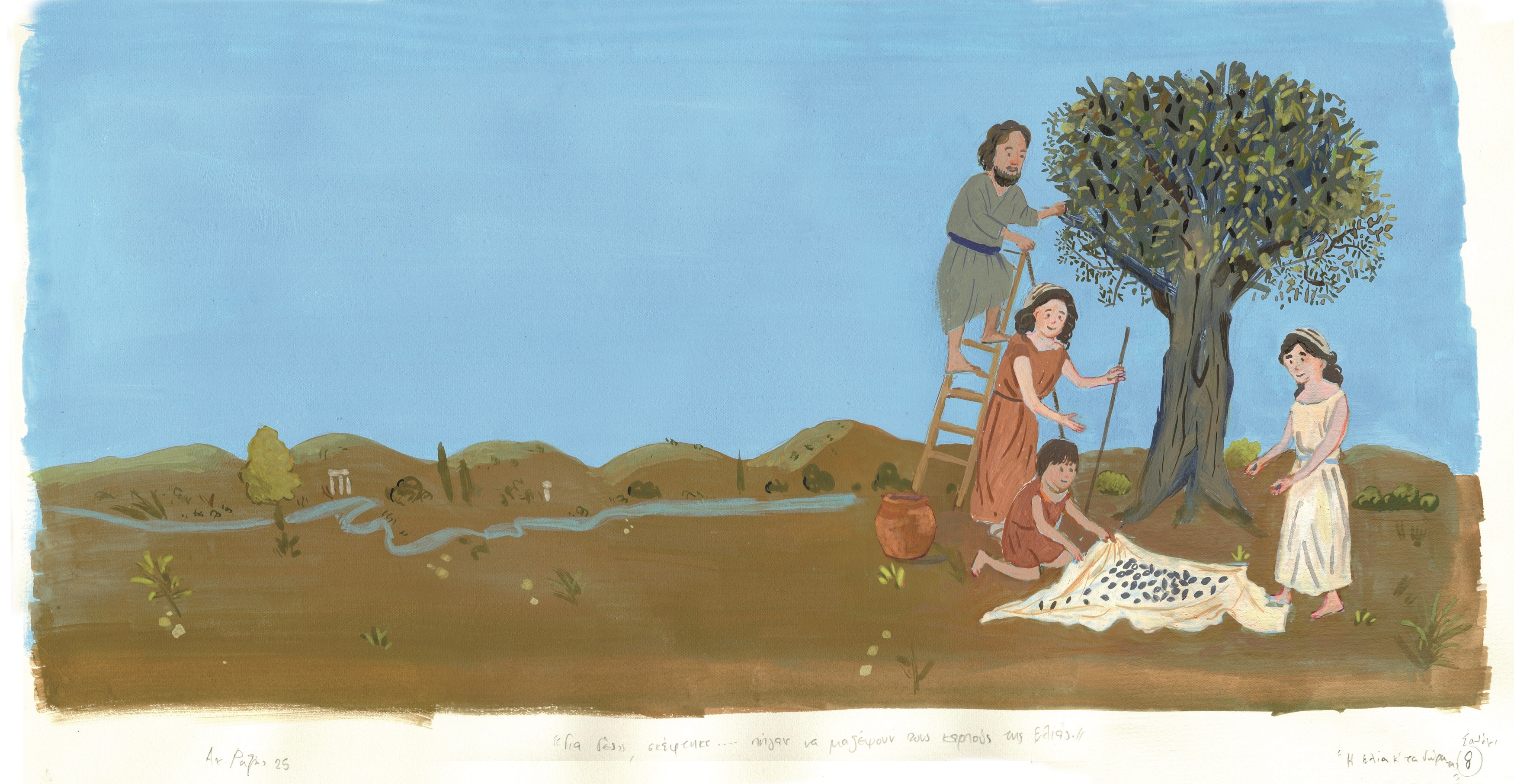 Η ιστορία συνδέεται άμεσα με τη θεματική του Μουσείου Ελιάς και Ελληνικού Λαδιού στη Σπάρτη, καθώς και του Μουσείου Βιομηχανικής Ελαιουργίας Λέσβου, μέλη του Δικτύου του ΠΙΟΠ. Μέσα από την αφήγηση, μια ελιά που αρχικά επιθυμεί να κρατήσει τους καρπούς της για τον εαυτό της, σύντομα αντιλαμβάνεται ότι η προσφορά γεννά αγάπη. Με σκιά, φύλλα, κλαδάκια, καρπούς και λάδι χαρίζει στους ανθρώπους όσα έχει και σε αντάλλαγμα αποκτά φροντίδα, συντροφιά και θέση στην καρδιά τους.