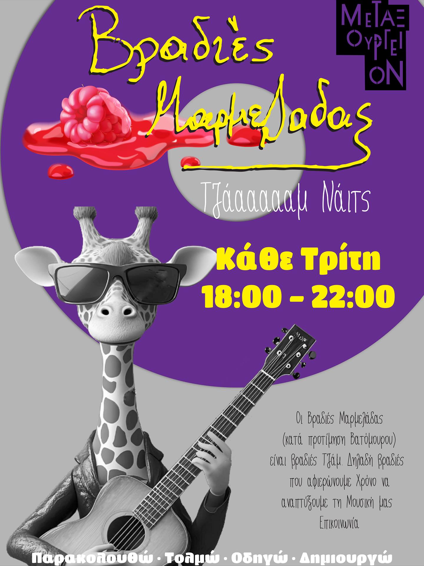 Με χιούμορ και διάθεση για χαλάρωση, η ομάδα πίσω από τη δράση υπενθυμίζει ότι οι «Βραδιές Μαρμελάδας» δεν είναι μόνο μουσικές συνευρέσεις, αλλά και ένας πολύτιμος χρόνος για να καλλιεργηθεί η μουσική προσωπική έκφραση, η συνεργασία και η καλλιτεχνική τόλμη.