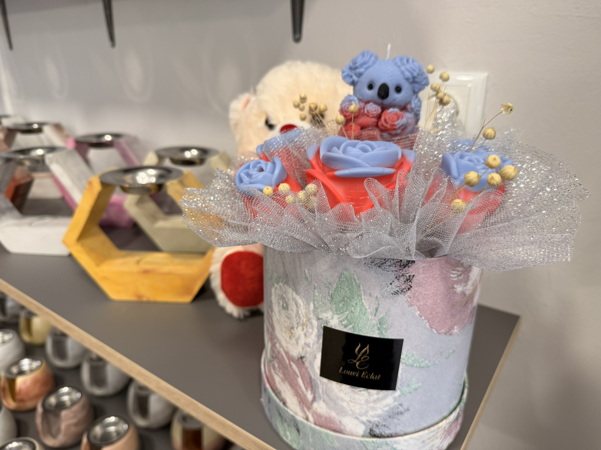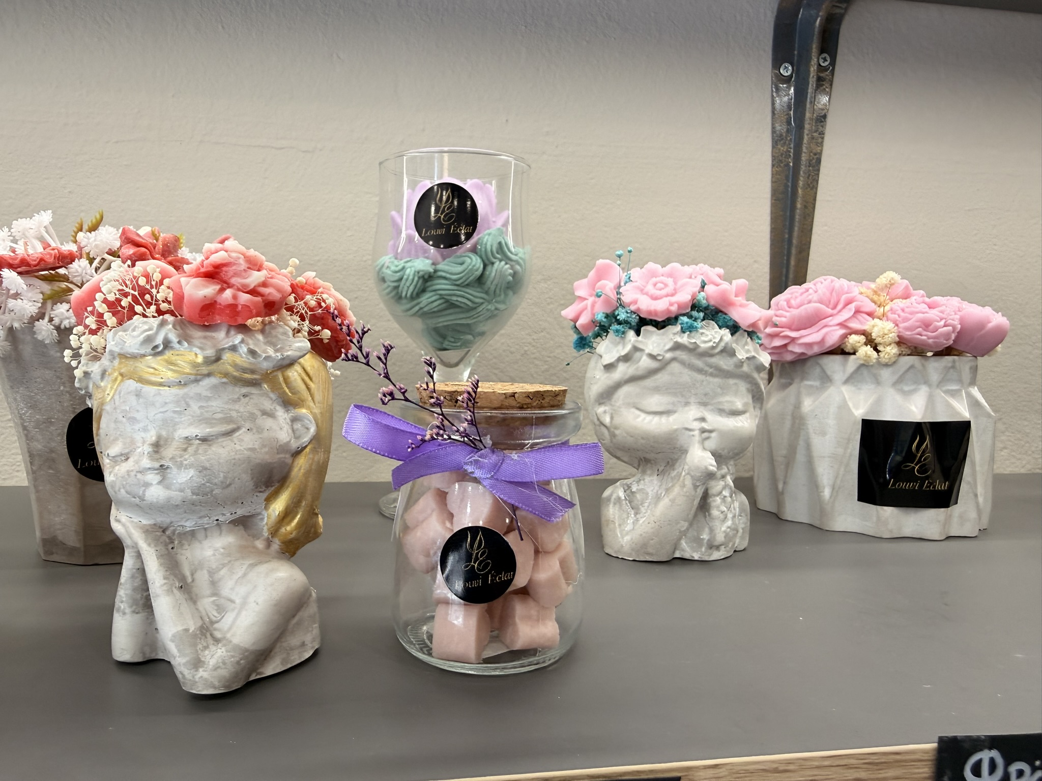 Μπαίνοντας στο κατάστημα, η πρώτη εντύπωση είναι η ζεστασιά και η φινέτσα του χώρου. Στην είσοδο σε καλωσορίζουν εντυπωσιακές συνθέσεις από κεριά και γύψινες κατασκευές, μικρά μπουκέτα με κέρινα λουλούδια και κομψές εποχιακές δημιουργίες. Τα αρώματα που αιωρούνται στον αέρα κάνουν αμέσως ξεχωριστή την εμπειρία: βανίλια, τριαντάφυλλο, κανέλα, φρέσκα λουλούδια ή πιο εξωτικά μείγματα –όλα επιλέξιμα ανάλογα με τη διάθεση ή την προσωπικότητα του παραλήπτη.