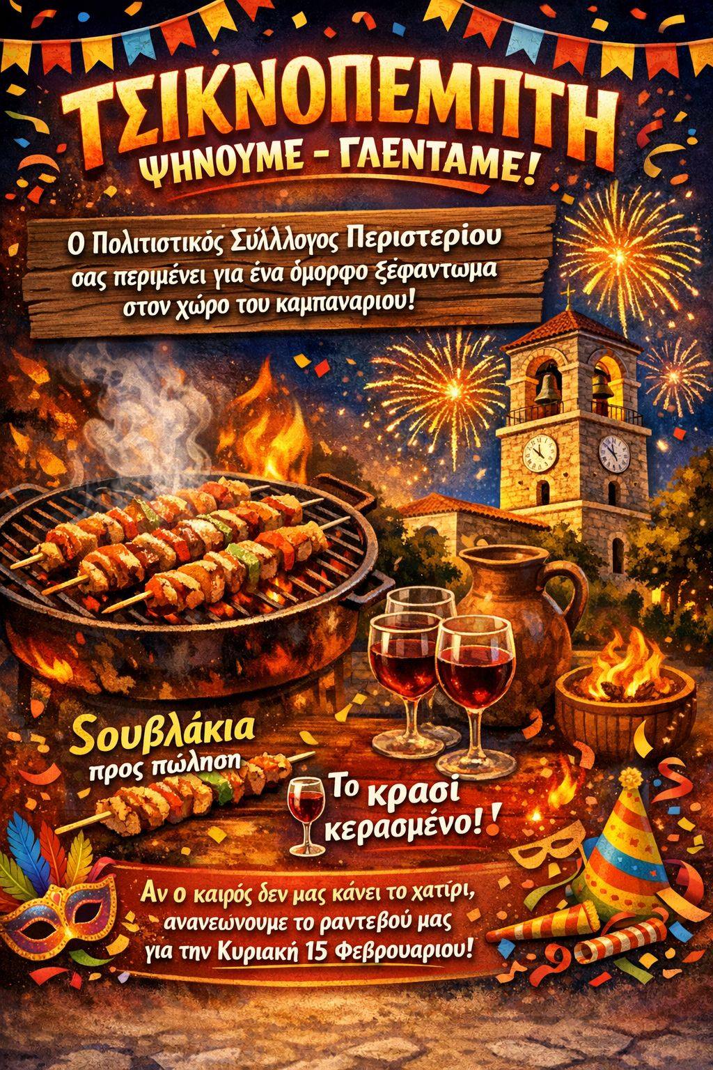 Σε ρυθμούς Τσικνοπέμπτης μπαίνει το Περιστέρι, καθώς ο Πολιτιστικός Σύλλογος της περιοχής προσκαλεί μικρούς και μεγάλους σε ένα αυθεντικό λαϊκό γλέντι γεμάτο γεύσεις, μουσικές και χαμόγελα. Το ραντεβού δίνεται στον χώρο του καμπαναριού, εκεί όπου η παράδοση συναντά την παρέα και το κέφι.
