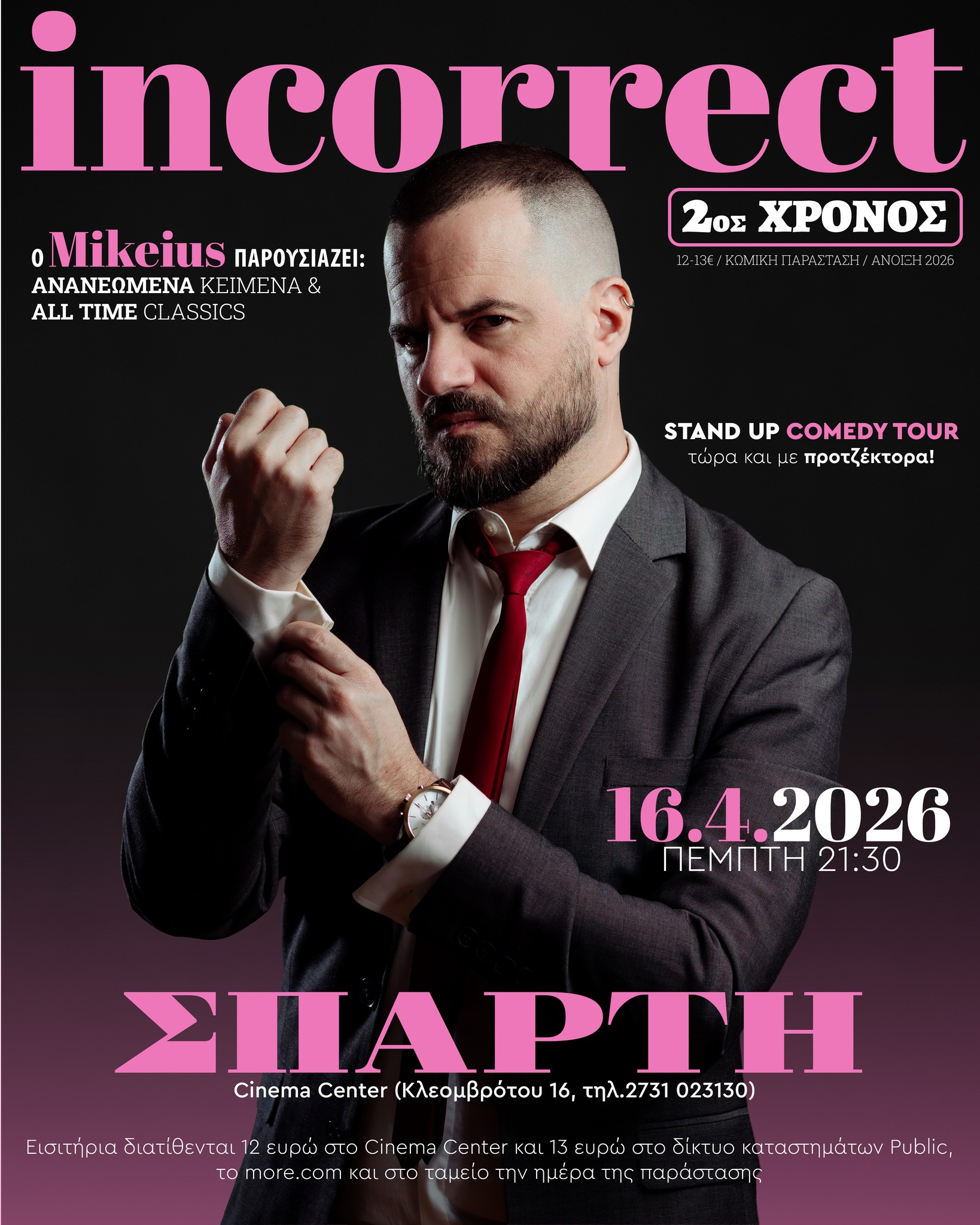 Την Πέμπτη 16 Απριλίου στις 21:30, το Cinema Center θα φιλοξενήσει μια παράσταση που δεν φοβάται να πει τα πράγματα με τ’ όνομά τους. Με τον χαρακτηριστικό του καυστικό λόγο, ο Mikeius επιστρέφει στη σκηνή για να σχολιάσει έναν κόσμο που μοιάζει να συγκρούεται ολοένα και περισσότερο με τις ίδιες του τις επιλογές γύρω από την πολιτική ορθότητα.