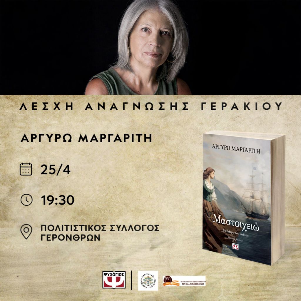 Ο Πολιτιστικός Σύλλογος Γερονθρών, σε συνεργασία με τη Λέσχη Ανάγνωσης Γερακίου, προσκαλούν το κοινό το Σάββατο 25 Απριλίου και ώρα 19:30, στη βιβλιοθήκη, σε μια ξεχωριστή εκδήλωση με καλεσμένη τη συγγραφέα Αργυρώ Μαργαρίτη.