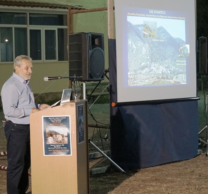 Χαιρετισμό στα εγκαίνια της έκθεσης απηύθυναν ο βουλευτής Λακωνίας κ. Σταύρος Αραχωβίτης, ο αντιδήμαρχος Σπάρτης κ. Βασίλειος Σκρουμπέλος και η αντιπεριφερειάρχης κ. Αδαμαντία Τζανετέα, η οποία ανακοίνωσε σημαντικά έργα για την περιοχή του Βόρειου Ταϋγέτου και κυρίως για την πρόθεση της Περιφέρειας Πελοποννήσου για την ένταξη σε έργο ΕΣΠΑ (2019-2020) της μελέτης ανάδειξης, προστασίας και συντήρησης του Βυζαντινού ναού του Αγίου Γεωργίου Λογκανίκου.