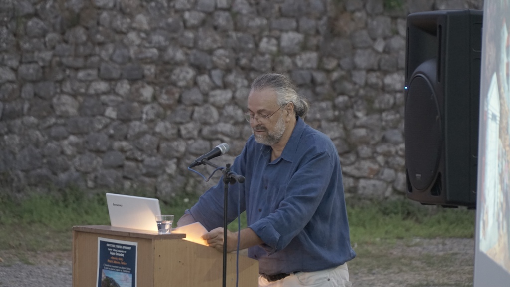 Ο αρχαιολόγος κ. Λεωνίδας Σουχλέρης, μίλησε συνολικά για το έργο του ζωγράφου, κάνοντας λόγο και για την απεικόνιση της καθημερινής ζωής στις κοινότητες του βόρειου Ταϋγέτου αλλά κυρίως για τις αφορμές, την έμπνευση και τις επιρροές του ζωγράφου για τα έργα στα οποία αποδίδει τα βυζαντινά μνημεία του Λογκανίκου, της Κοτίτσας και του Μυστρά, με ιδιαίτερη αναφορά στον βυζαντινό ναό του Αγίου Γεωργίου Λογκανίκου (1374-1375). Σημαντική ήταν η επισήμανση για το ενδιαφέρον του ζωγράφου και για την αφορμή και τους λόγους της ζωγραφικής απεικόνισης ή φανταστικής αναπαράστασης των αρχαίων μνημείων της Σπάρτης (Ακρόπολη Σπάρτης, θέατρο, Ιερό Ορθίας Αρτέμιδος, Κυκλοτερές Οικοδόμημα, Ιερό Αμυκλαίου Απόλλωνα), όπου σημαντικό ρόλο διαδραμάτισε η ανάδειξη των μνημείων αυτών από την Εφορεία Αρχαιοτήτων Λακωνίας και την Περιφέρεια Πελοποννήσου, την χρονική περίοδο 2006-2015, όπου για πρώτη η Ακρόπολη της Σπάρτης αποτελεί πλέον οργανωμένο και επισκέψιμο αρχαιολογικό χώρο στον Δήμο Σπάρτης.
