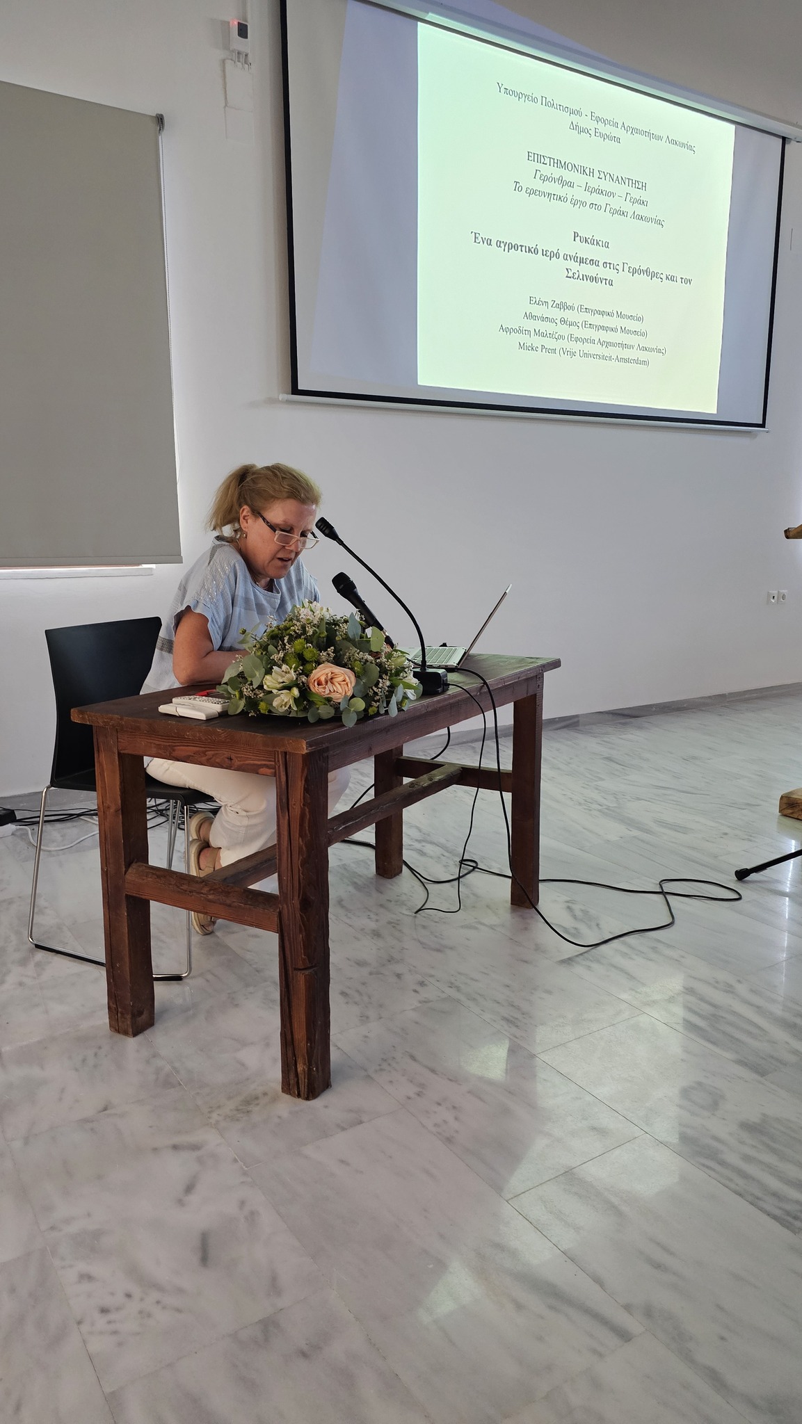 Αρχαιολόγοι του Υπουργείου Πολιτισμού, που υπηρετούν στην Εφορεία Αρχαιοτήτων Λακωνίας και το Επιγραφικό Μουσείο, καθώς και επιστήμονες του Vrije Universiteit Amsterdam, παρουσίασαν το έργο της Αρχαιολογικής Υπηρεσίας στην περιοχή, την έρευνα στην ακρόπολη των αρχαίων Γερονθρών και στο κάστρο Γερακίου, καθώς επίσης στην αρχαία κώμη του Σελινούντα και το μεταξύ αυτής και των αρχαίων Γερονθρών ιερό στα Ρυκάκια Γερακίου.