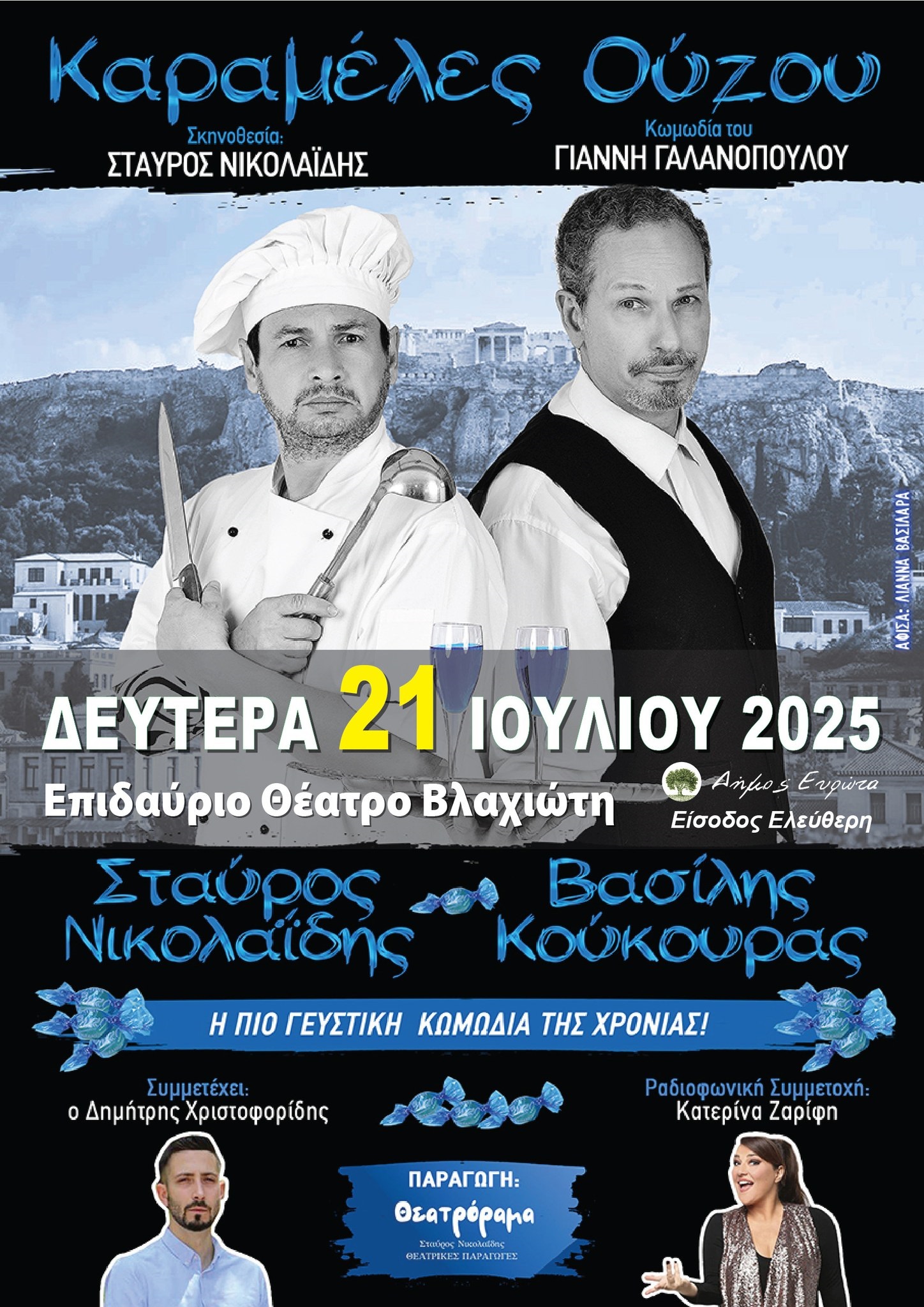 Μία θεατρική βραδιά γεμάτη γέλιο, χιούμορ και γαστρονομικές εκπλήξεις, με την κωμωδία «Καραμέλες Ούζου», παρουσιάζει ο Δήμος Ευρώτα. Η παράσταση ανεβαίνει αυτή τη Δευτέρα 21 Ιουλίου στο Επιδαύριο Θέατρο Βλαχιώτη, με ώρα έναρξης 9 μμ.