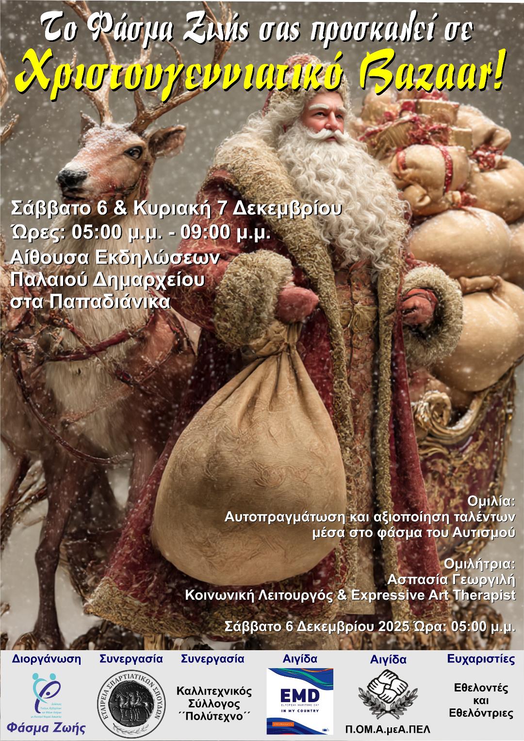 Μια ζεστή, γιορτινή δράση με κοινωνικό χαρακτήρα ετοιμάζει το «Φάσμα Ζωής», το οποίο διοργανώνει Χριστουγεννιάτικο Bazaar το Σάββατο 6 και την Κυριακή 7 Δεκεμβρίου, από τις 5:00 έως τις 9:00 το απόγευμα. Η εκδήλωση θα φιλοξενηθεί στην Αίθουσα Εκδηλώσεων του Παλαιού Δημαρχείου στα Παπαδιάνικα, προσκαλώντας μικρούς και μεγάλους σε μια ατμόσφαιρα γεμάτη ζεστασιά, δημιουργικότητα και χριστουγεννιάτικη διάθεση.