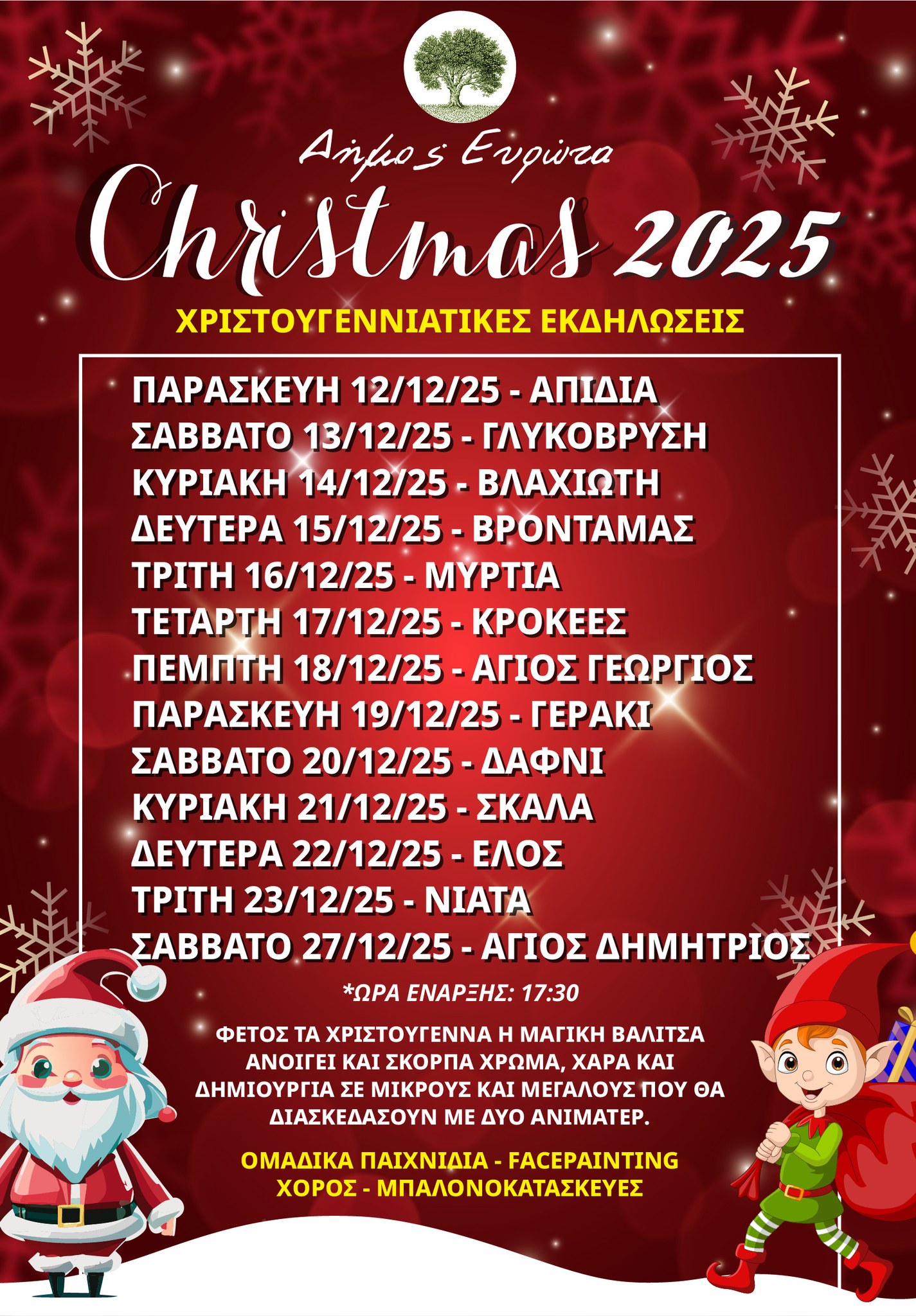 Ο Δήμος Ευρώτα υποδέχεται τις γιορτές με έναν μοναδικό τρόπο: μετατρέποντας ολόκληρη την περιοχή σε μια μεγάλη, φωτεινή, γιορτινή διαδρομή που ταξιδεύει από χωριό σε χωριό. Από τις 12 έως τις 27 Δεκεμβρίου, οι πλατείες και οι κοινότητες του Δήμου ζωντανεύουν με παιχνίδι, μουσική, δημιουργία και χριστουγεννιάτικο κέφι για μικρούς και μεγάλους.