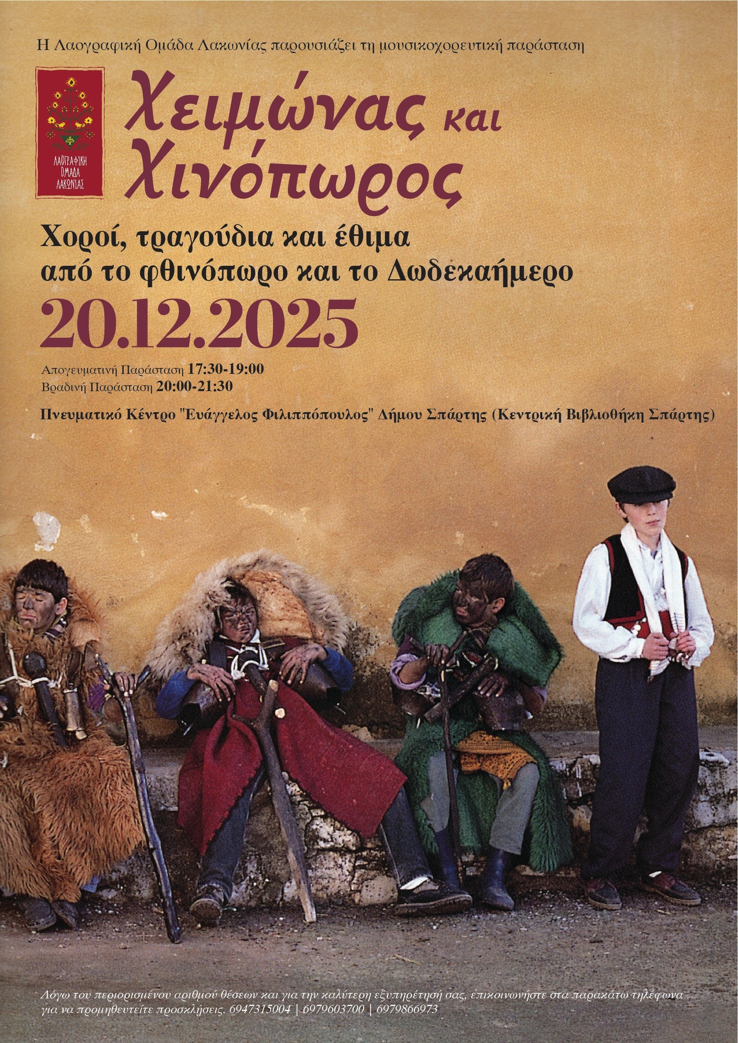Για πρώτη φορά στη Σπάρτη, η Λαογραφική Ομάδα Λακωνίας φέρνει στην αιθουσα του Πνευματικού Κέντρου Δήμου Σπάρτης «Ευάγγελος Φιλιππόπουλος» τη χειμωνιάτικη μουσικοχορευτική παράσταση «Χειμώνας και Χινοπώρος», μια μοναδική χειμωνιάτικη παράσταση γεμάτη παράδοση, χορό και μουσική. Το Σάββατο 20 Δεκεμβρίου, μικροί και μεγάλοι θα έχουν την ευκαιρία να ταξιδέψουν μέσα από τα έθιμα, τους χορούς και τα τραγούδια του Δωδεκαημέρου αλλά και του φθινοπώρου, όπως τα θυμούνται οι παλιότερες γενιές.