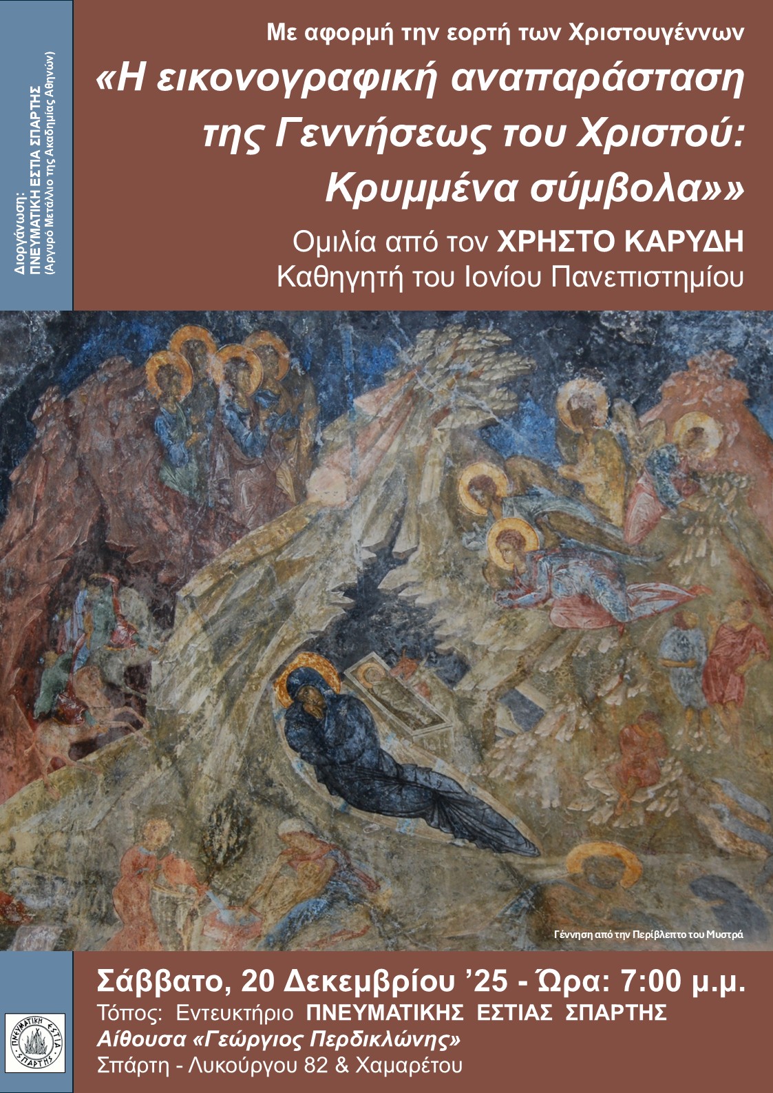 Μια ξεχωριστή πνευματική και πολιτιστική εκδήλωση, αφιερωμένη στο βαθύ θεολογικό νόημα της εορτής των Χριστουγέννων, φιλοξενεί η Πνευματική Εστία Σπάρτης το Σάββατο 20 Δεκεμβρίου, στις 7:00 το απόγευμα, στις εγκαταστάσεις της (Λυκούργου 82 & Χαμαρέτου).
