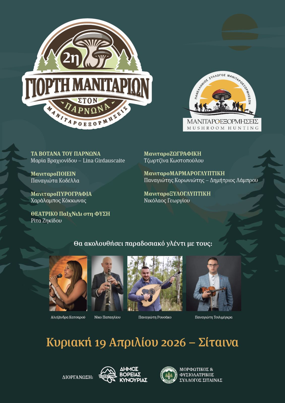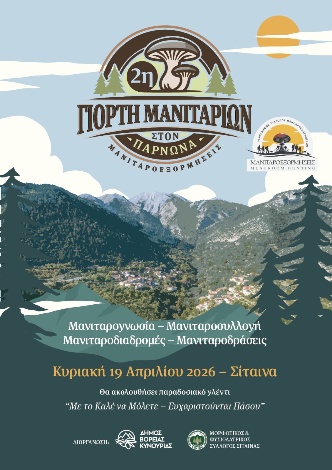 Μια ξεχωριστή εμπειρία στη φύση, που συνδυάζει ορειβατική εξόρμηση, γνώση, δημιουργία και παραδοσιακό γλέντι, υπόσχεται η 2η Γιορτή Μανιταριών στον Πάρνωνα, η οποία θα πραγματοποιηθεί την Κυριακή 19 Απριλίου στη Σίταινα Κυνουρίας.