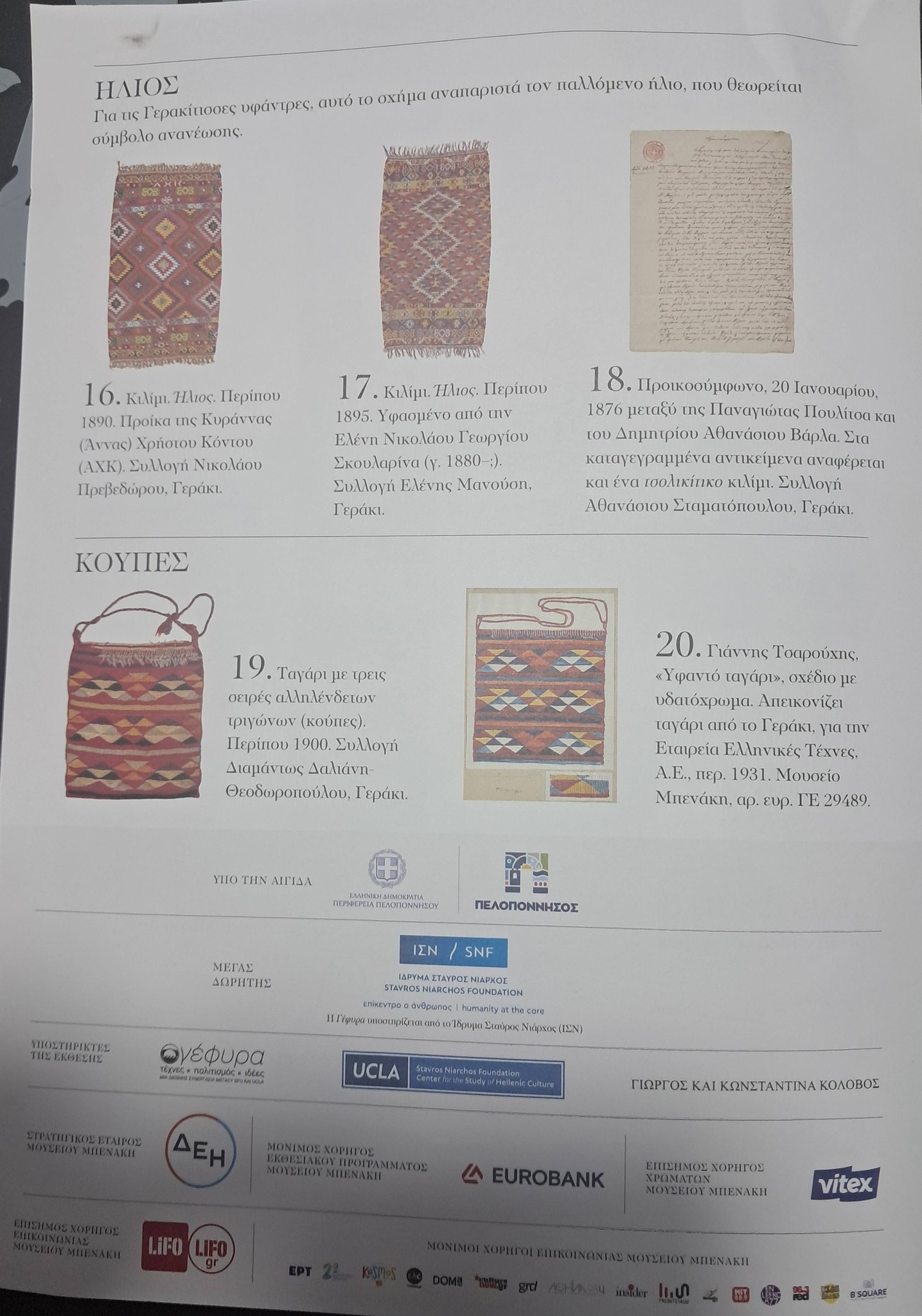 Η έκθεση στο Μουσείο Μπενάκη παρουσιάζει υφαντά από τον 17ο έως τις αρχές του 20ού αιώνα, δίνοντας έμφαση σε έργα που αποτυπώνουν την ανθρώπινη παρουσία μέσα σε ένα συμβολικό και σχεδόν ποιητικό περιβάλλον. Δεν πρόκειται απλώς για αντικείμενα τέχνης, είναι αφηγήσεις χειροπιαστές, με υλική υπόσταση, που τις αγγίζεις και σε ζεσταίνουν στην αφή. Όπως χαρακτηριστικά σημειώνεται από τον Πολιτιστικό Σύλλογο Γερονθρών, «κάθε σχέδιο δεν είναι τυχαίο. Είναι σύμβολο. Είναι προσευχή. Είναι ένας τρόπος να πεις “υπάρχω” χωρίς λέξεις».