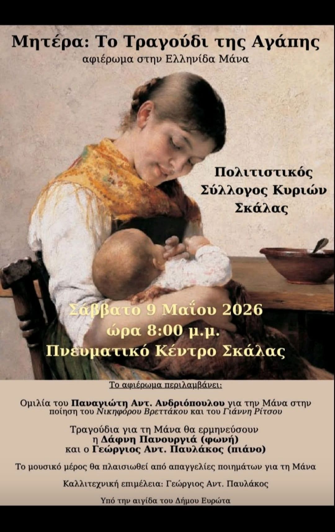 Μια βραδιά όπου η ποίηση, η μουσική και ο λόγος συναντούν την πιο αρχέγονη και πανανθρώπινη μορφή, τη Μάνα, ετοιμάζεται να φιλοξενήσει το Πνευματικό Κέντρο Σκάλας το Σάββατο 9 Μαΐου, στις 8:00 μ.μ., στο πλαίσιο μιας εκδήλωσης με τίτλο «Μητέρα: Το Τραγούδι της Αγάπης».