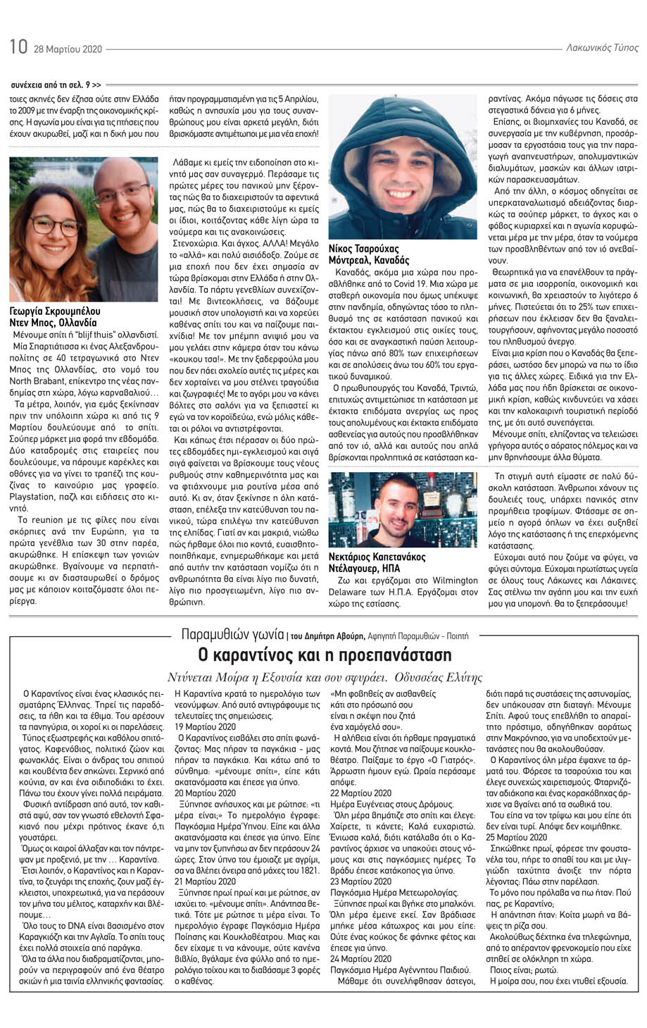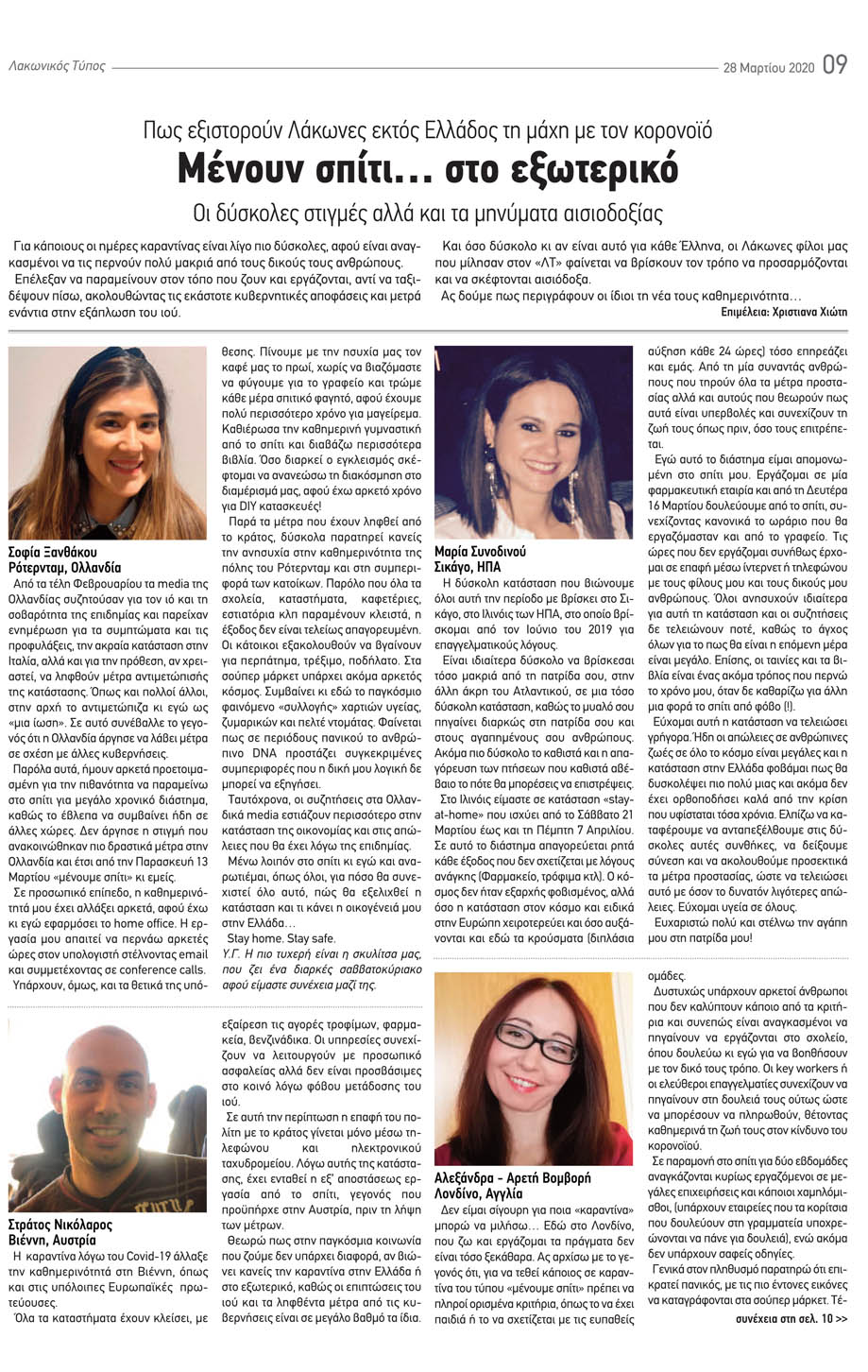 Λάκωνες που διαμένουν εκτός Ελλάδας, είτε για επαγγελματικούς είτε για εκπαιδευτικούς λόγους, μας περιγράφουν το πώς βιώνουν τις ημέρες καραντίνας, λόγω κορονοϊού, στον τόπο που ζουν.